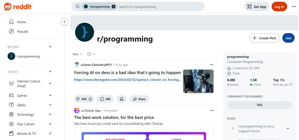 If you’re searching for a subreddit that covers all aspects of software development, /r/programming is the place to go. This community gathers programmers from various fields. They engage in deep technical talks and share the latest technology news.