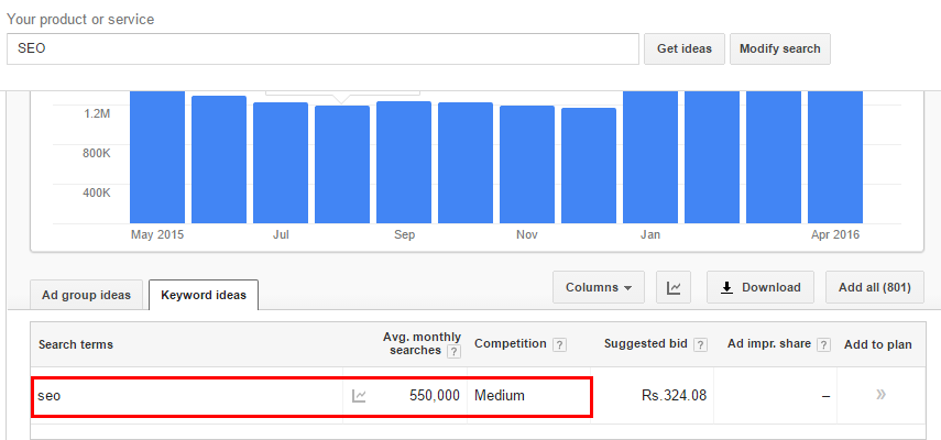 Example: If you search the word “SEO” on the Google Keyword Planner you will get average monthly search for the keyword in millions and competition will be medium.